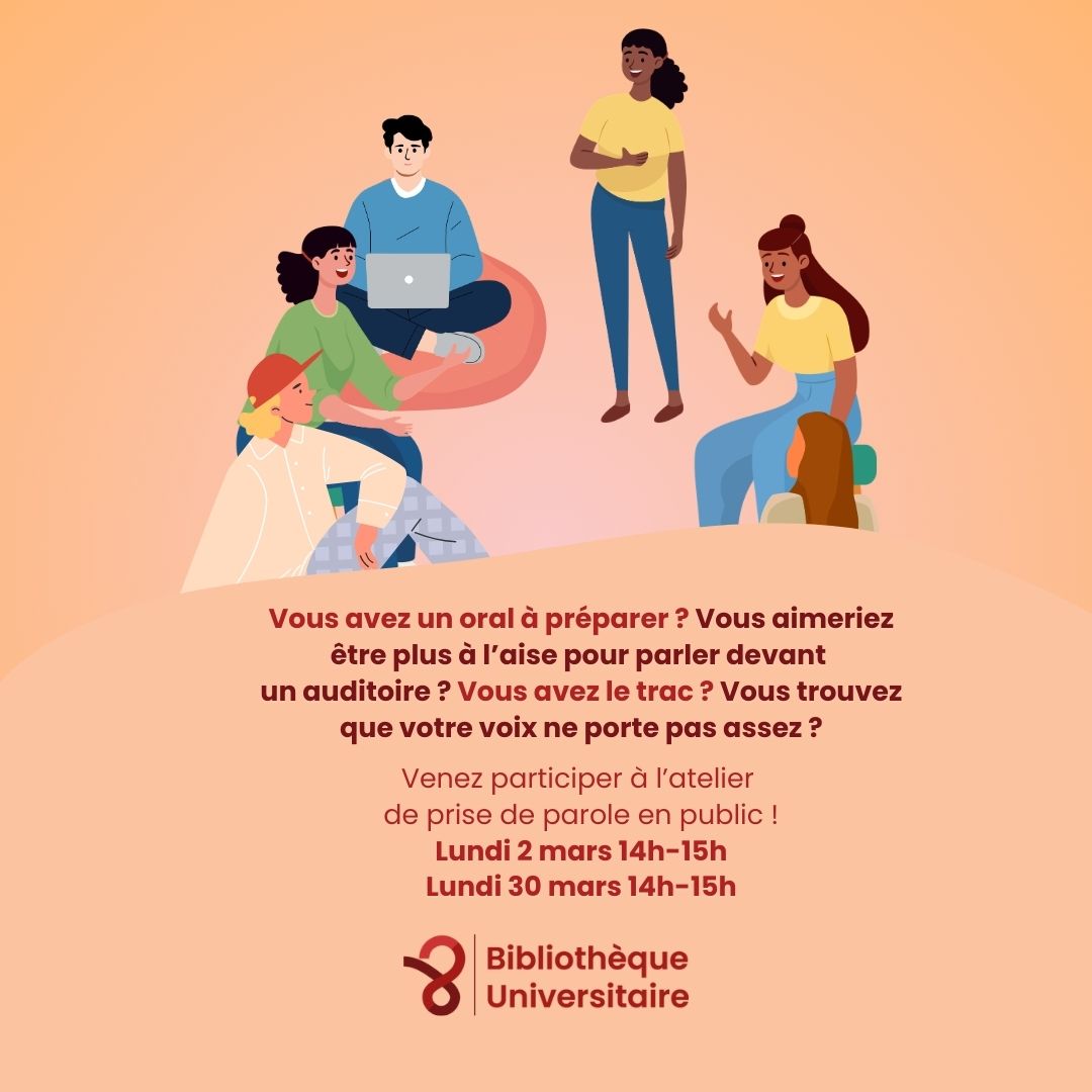 - 2 mars 202614 h 00 – 15 h 00Lancement d’un nouvel atelier : prise de parole en public !lieu : Salle de la recherche (BU)