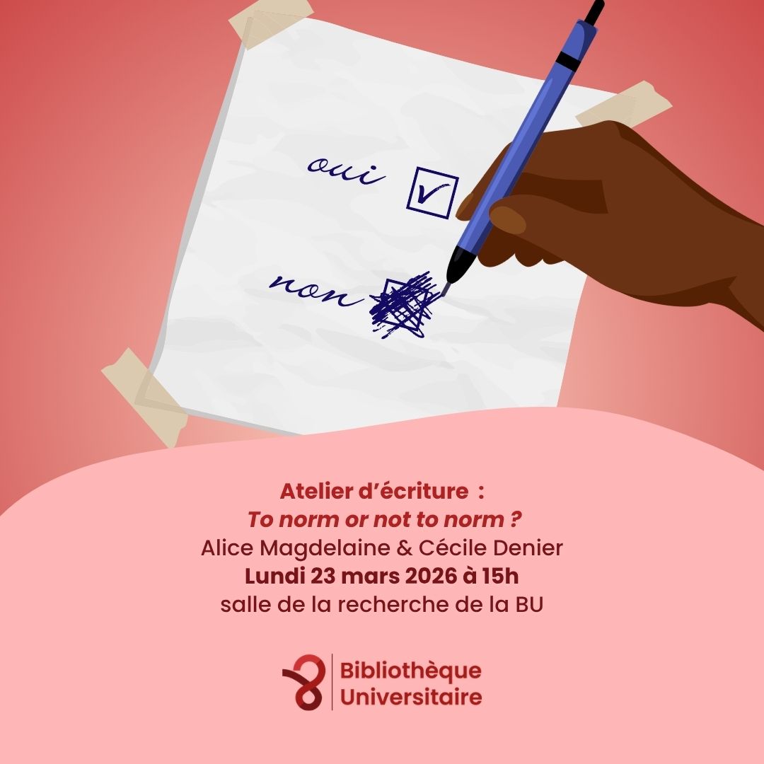 - 23 mars 202615 h 00 – 17 h 00Atelier d'écriture : To norme or not to norme ?lieu : Salle de la recherche (BU)