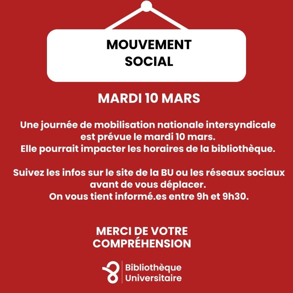 En raison d’une journée de mobilisation, la BU restera fermée toute la journée. Nous vous remercions de votre compréhension et vous prions de nous excuser pour la gêne occasionnée.