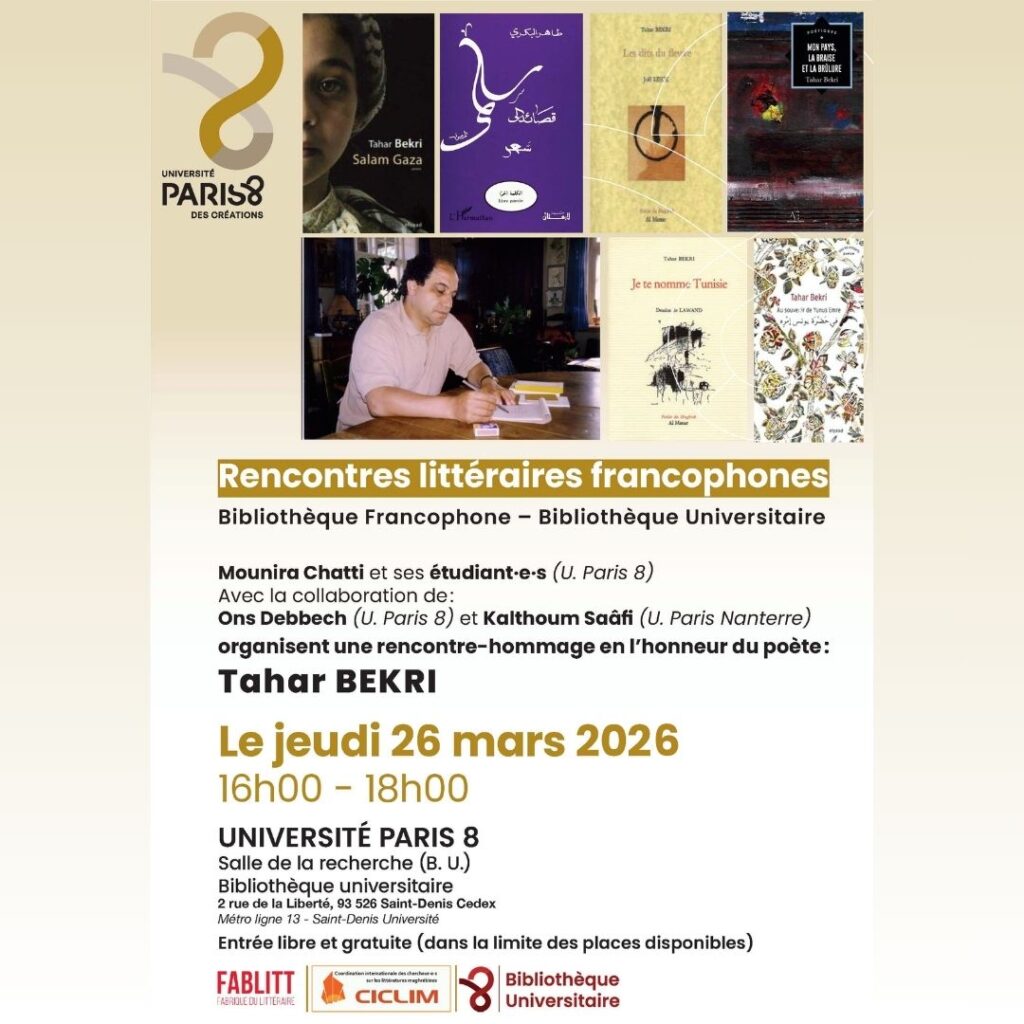 Mounira Chatti et ses étudiant·e·s (Paris 8), avec la collaboration de Ons Debbech (Paris 8) et Kalthoum Saâfi (Paris Nanterre) organisent une rencontre-hommage en l’honneur du poète Tahar Bekri, le jeudi 26 mars 2026 de 16h à 18h en salle de recherche de la BU Paris 8 (2 rue de la Liberté, Saint-Denis, métro ligne 13 – Saint-Denis Université).