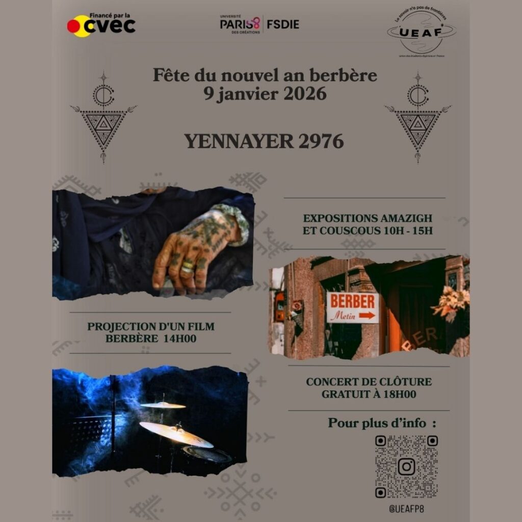 Nous sommes très heureux.ses de vous inviter à YENNAYER 2976 “Le Nouvel An Berbère”, ouvert à tous, le vendredi 9 janvier 2026 à la Coupole de la Maison de l’Etudiant.e.