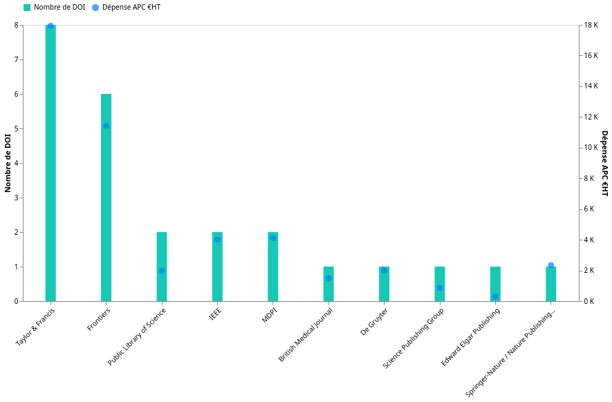 Nombre d’articles Open Access collectés et dépense APC globale (€HT) par éditeur (toutes années confondues)